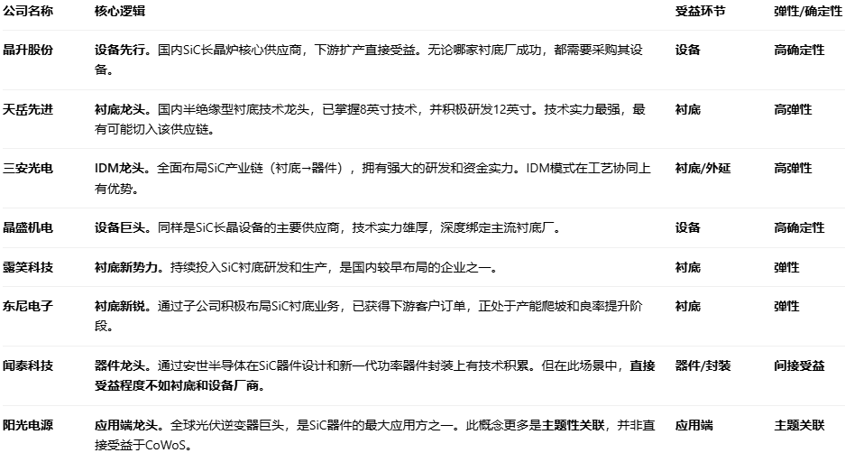 - 最确定性受益:无论最终哪家衬底厂胜出,它们要扩产都必须先购买长晶炉。因此,晶升股份、晶盛机电作为设备商,受益最为确定,是“卖水人”。