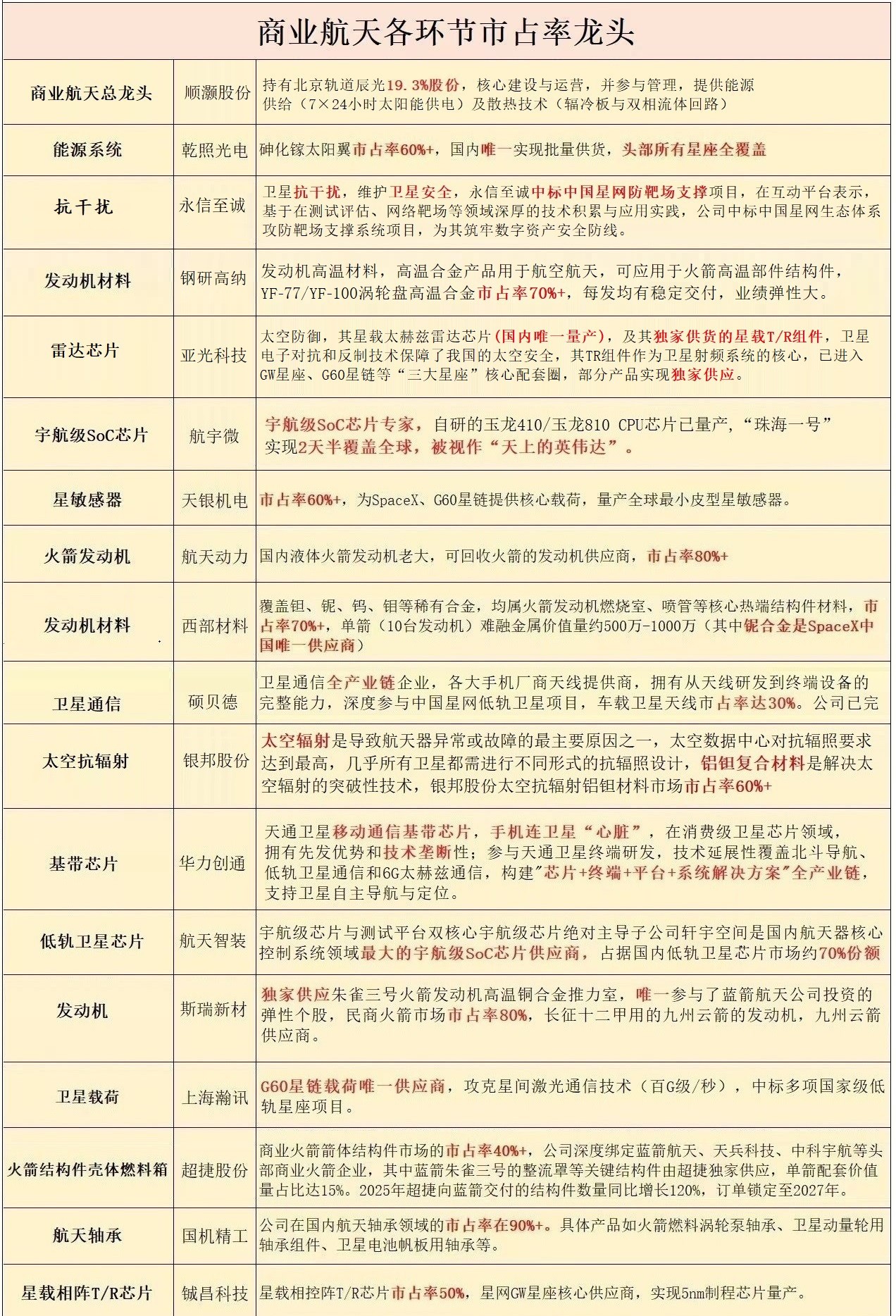 - 核心企业:永信至诚、亚光科技、天银机电、航天发展、中国卫星(抗干扰);乾照光电、顺灏股份、航宇微、神剑股份、再升科技、钢研高纳、通宇通讯、长江通信(商业航天)。