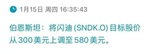 伯恩斯坦(Bernstein)在1月15日(周四)将闪迪 (SNDK.O) 的目标股价从300美元大幅上调至580美元,这是一个强烈的看多信号,通常意味着该投行认为公司基本面(如存储芯片市场、公司业绩或并购预期等)将显著向好。