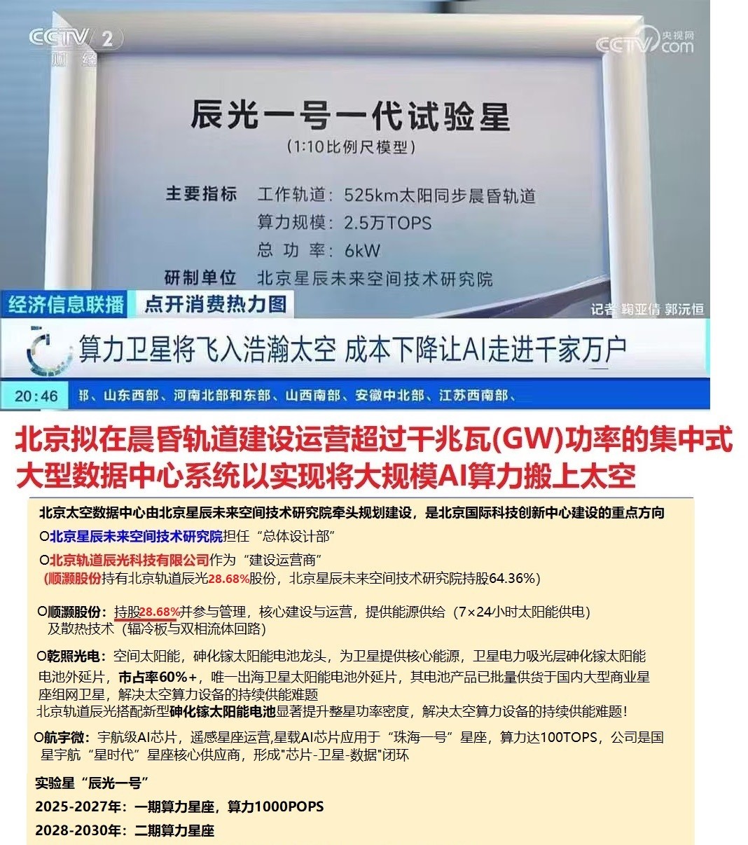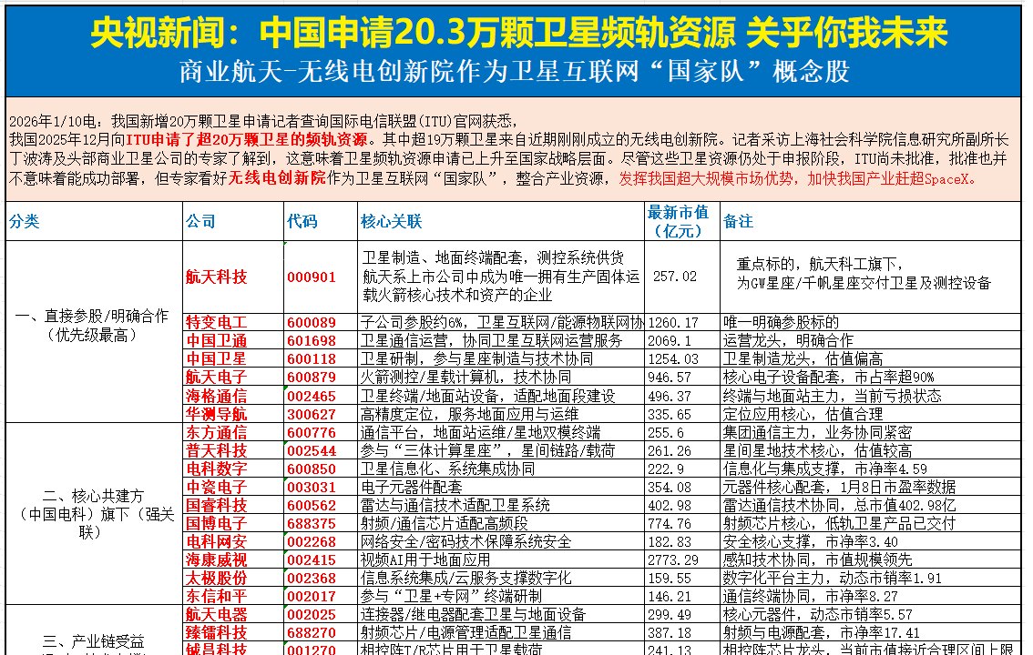 - 核心逻辑:中科宇航IPO辅导状态已更新为“辅导验收”,上市进程加快;央视明确中国申请20.3万颗卫星频轨资源为国家战略性长远布局,旨在支撑卫星互联网规模化并深刻改变未来数字生活。