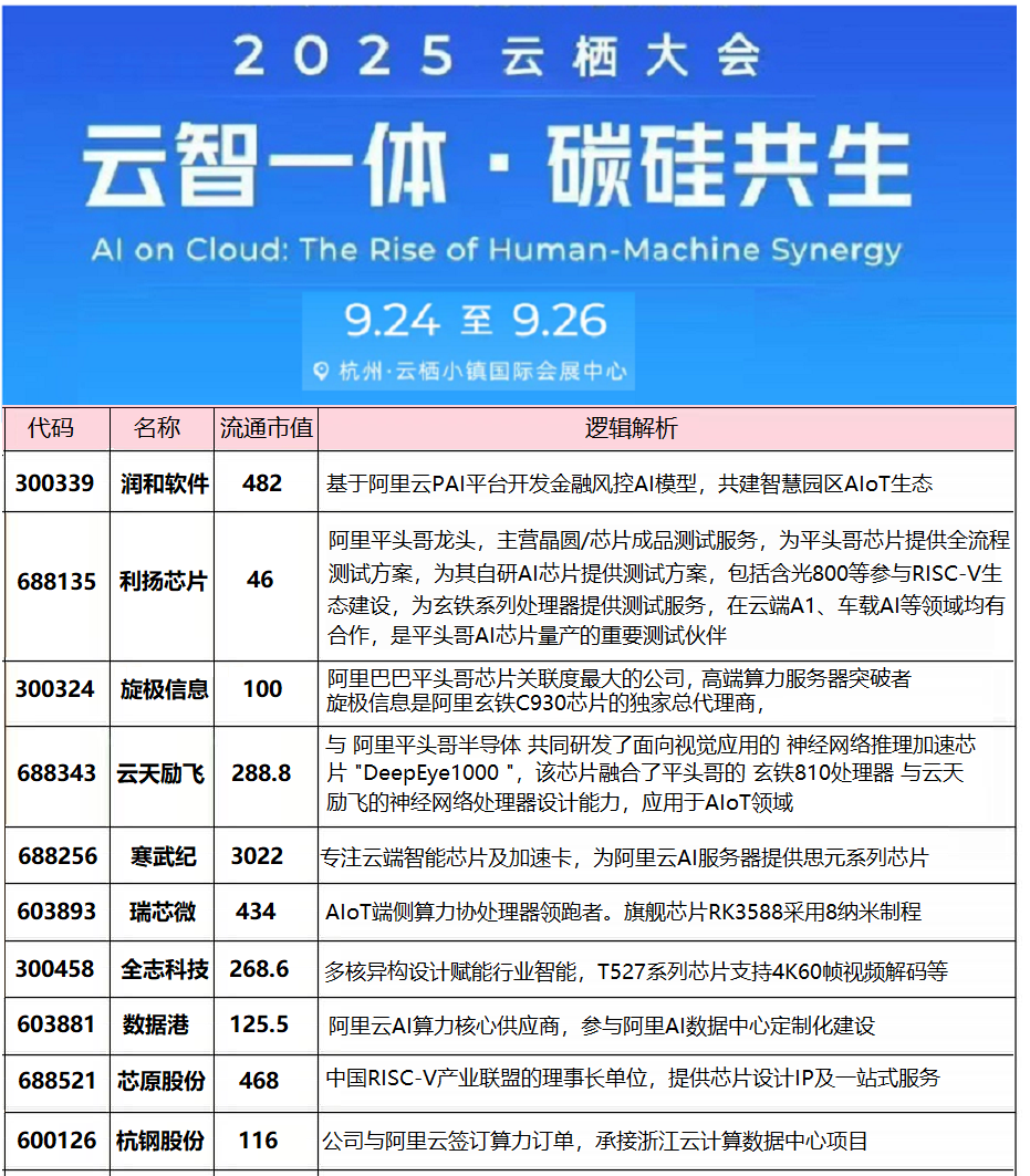 ⑤阿里/算力:2025年阿里云栖大会(9月24日至26日)即将召开,主题为“云智一体·碳硅共生”,聚焦AI、云计算、大数据等前沿领域。微软投资70余亿美元建立“世界最强”AI数据中心,将容纳数十万块英伟达GB200芯片。相关企业包括利扬芯片、长飞光纤、润和软件、利和兴、力源信息、腾景科技、中际旭创、寒武纪等。