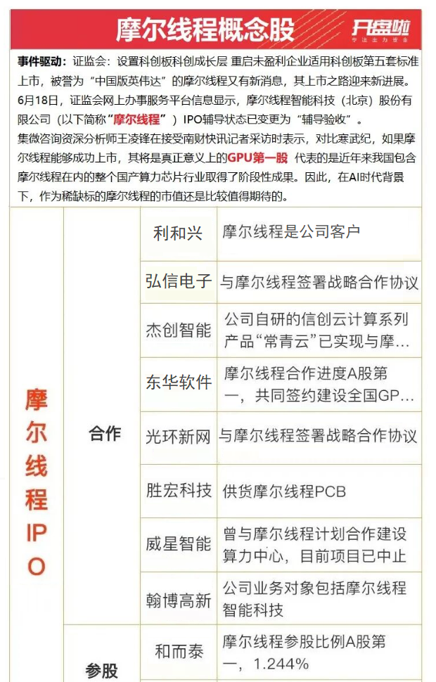 ⑥摩尔线程:上交所定于9月26日召开2025年第40次上市审核委员会审议会议,审议摩尔线程智能科技(北京)股份有限公司(首发)。相关企业包括利和兴、弘信电子、杰创智能、东华软件、光环新网、胜宏科技、和而泰等。