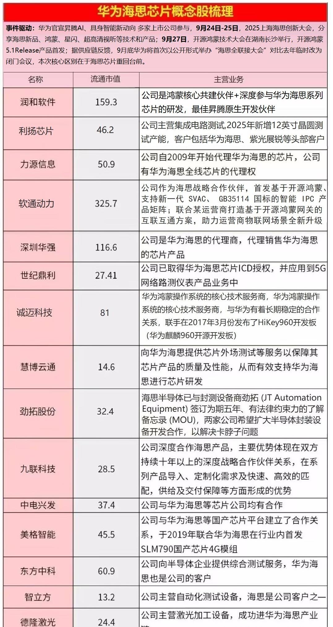 ①华为链:昇腾950/960/970芯片全部发布!华为强调超节点集群让中国算力无忧。9月24日至25日,2025上海海思创新大会将分享海思新品、鸿蒙、星闪、超高清视听等技术和产品。9月27日,开源鸿蒙技术大会在湖南长沙举行,鸿蒙5.1 Release产品将首发。相关企业包括润和软件、利扬芯片、拓斯达、利和兴、力源信息、拓维信息、软通动力等。