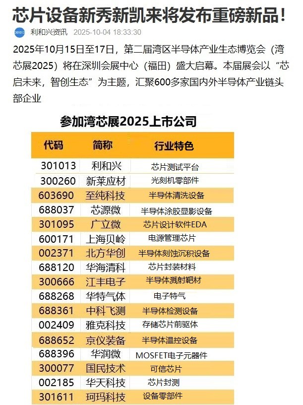 - 核心逻辑:第二届湾区半导体产业生态博览会(湾芯展2025)将于10月15–17日在深圳举办,芯片设备企业新凯来确认参展并将发布重磅新品,市场关注其产品与技术突破。