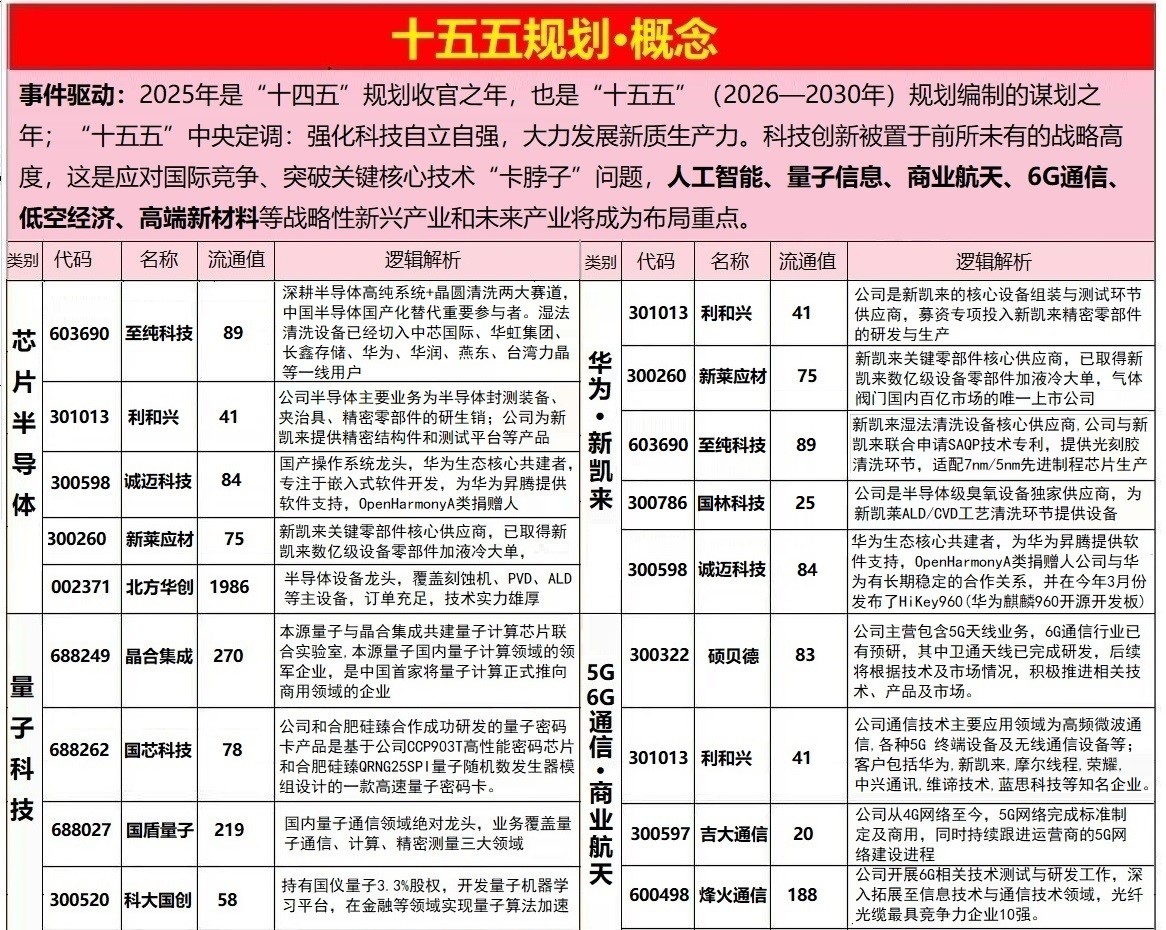 - 核心逻辑:2025年为“十五五”规划谋划关键年,四中全会定于10月20–23日召开,人工智能、集成电路、6G通信、量子信息等前沿科技领域为重点方向。
