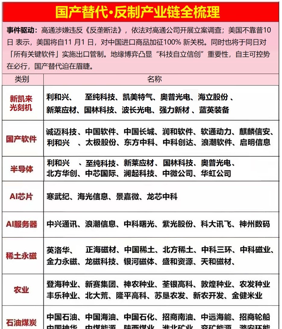 - 核心逻辑:高通涉嫌违反《反垄断法》被立案调查;美方计划自11月1日起对中国进口商品加征100%新关税,并对“所有关键软件”实施出口管制。地缘博弈持续凸显科技自立与信创产业链自主可控的紧迫性。