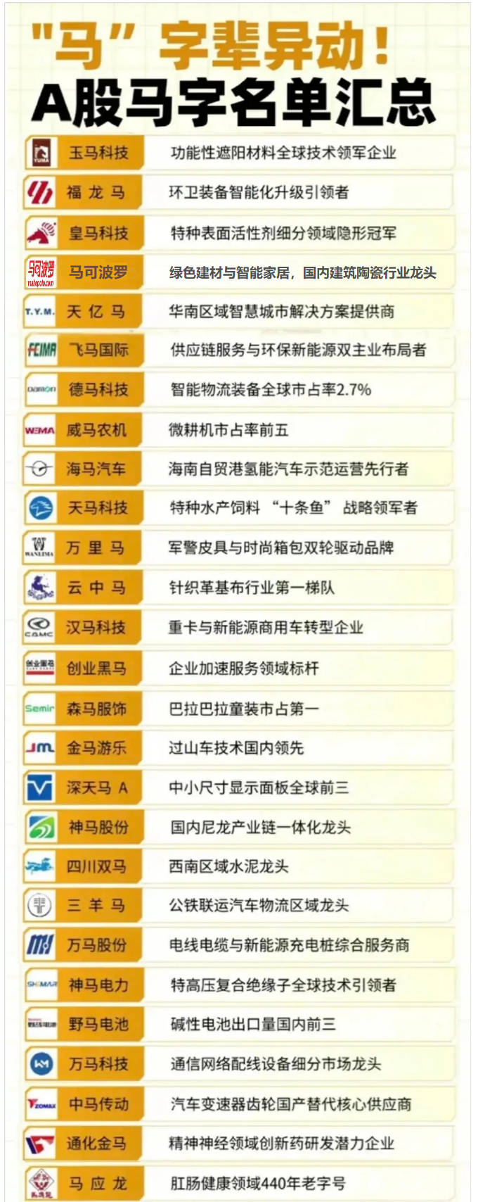 - 核心企业:玉龙股份(原名玉马科技)、福龙马、皇马科技、马可波罗、天亿马、飞马国际、德马科技、威马农机、海马汽车、万里马。