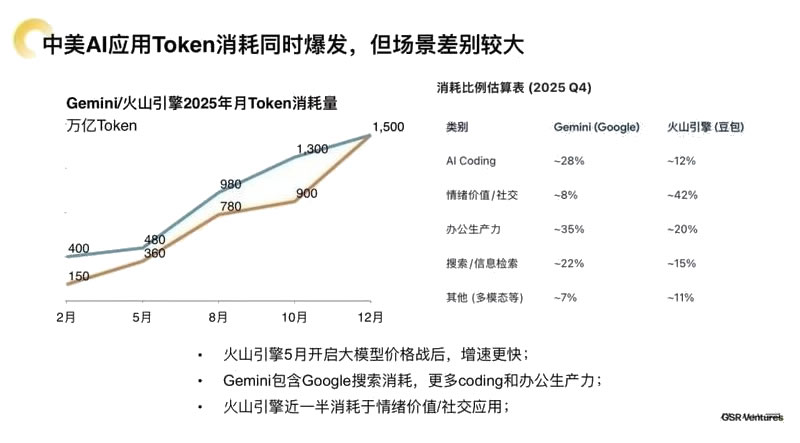 - 火山引擎(豆包):近一半消耗(约42%)集中于情绪价值/社交应用,其次是办公生产力(约15%)和AI编码(约12%),反映其更侧重社交与情感交互场景。