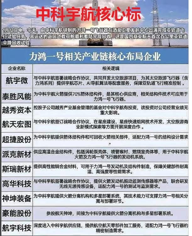 - 核心企业:天银机电、旋极信息、上海瀚讯、航宇微、信维通信、信科移动、顺灏股份(商业航天);乾照光电、三安光电、晶盛机电、迈为股份、钧达股份(太空光伏)。