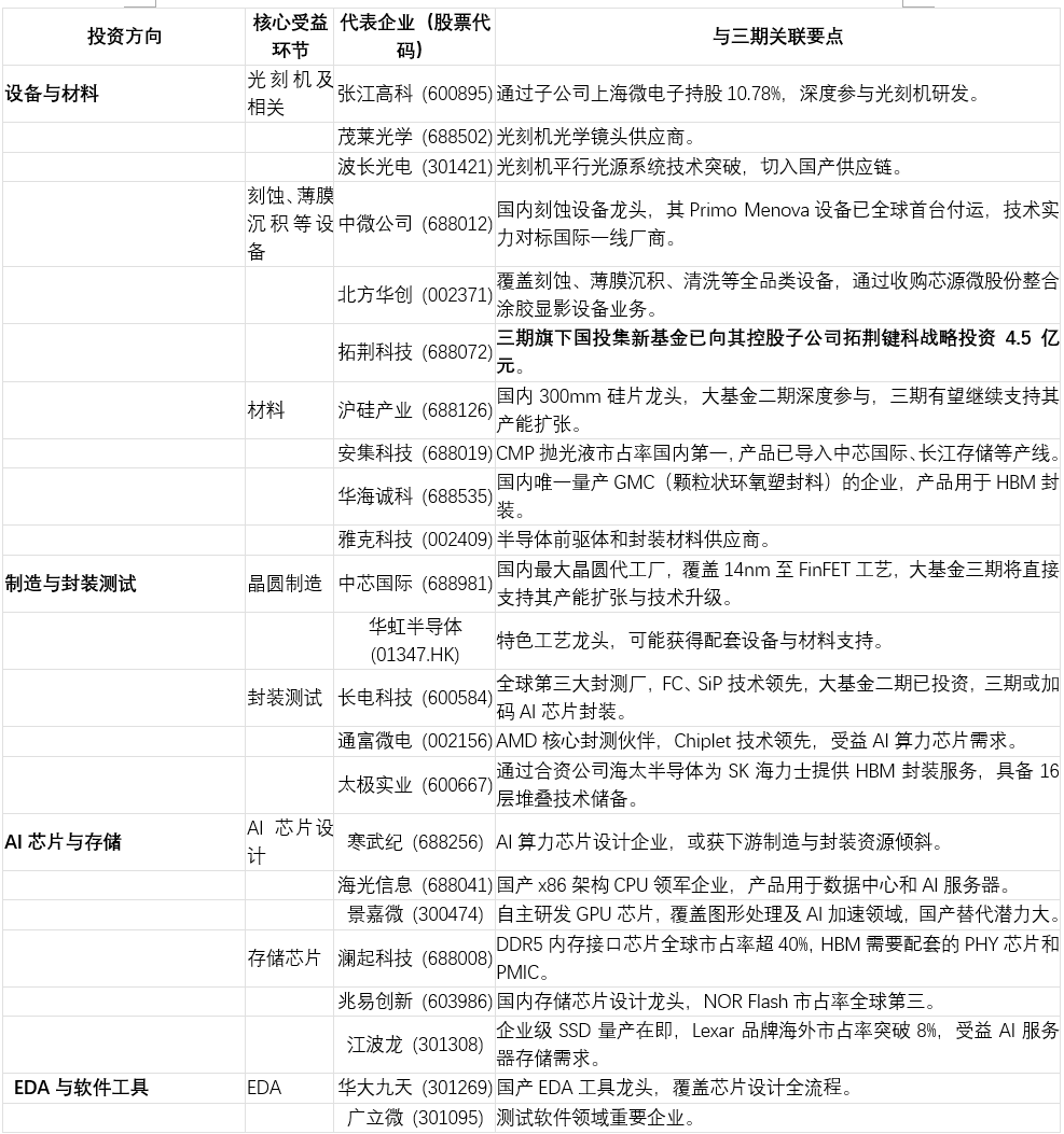 - 三期投资特点:大基金三期采用 “母基金+子基金” 的创新架构,已设立华芯鼎新基金(930亿元,聚焦半导体制造与设备)、国投集新基金(710亿元,侧重先进封装与材料)和AI专项基金(600.6亿元,投向AI芯片、算力基础设施) 。许多投资会通过这些子基金进行。
