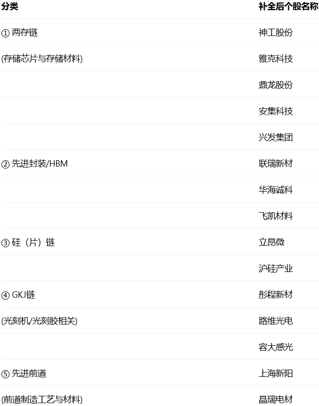 受益于存储涨价传导及情绪扩散,半导体材料版块昨日大涨(指数+6.35%)。无论是短期情绪还是长期产业链趋势,材料版块都值得配置,后续将持续受益两存 、先进制程扩产 、GKJ 、先进封装等行业变化,建议持续关注。 逻辑1:存储涨价→两存扩产预期增强→前后道设备CAPEX→材料OPEX 逻辑2:AI扩容+非AI复苏→硅片需求提升→部分硅片涨价 逻辑3:光刻机各种催化→零部件+光刻胶、掩膜版等光刻配套 ...