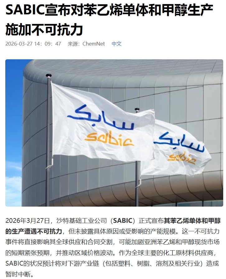 - 沙特(SABIC):3 月 27 日宣布甲醇及苯乙烯遭遇不可抗力。其朱拜勒工厂是全球最大的单体甲醇基地(年产能约 470 万吨),该装置的停摆直接削减了面向欧洲和亚洲的高端合约供应 。