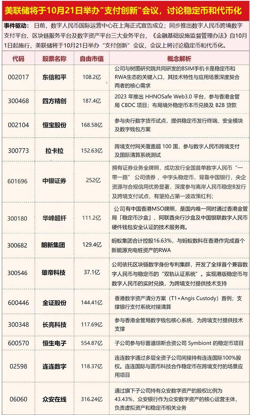 ②数字货币-美联储将于10月21日举办“支付创新”会议,会议上将讨论稳定币、人工智能和代币化;稳定币正式发牌有望在9-10月陆续开始;稳定币牌照发放倒计时;相关企业包括东信和平、恒宝股份、 四方精创、京北方 、中油资本 等