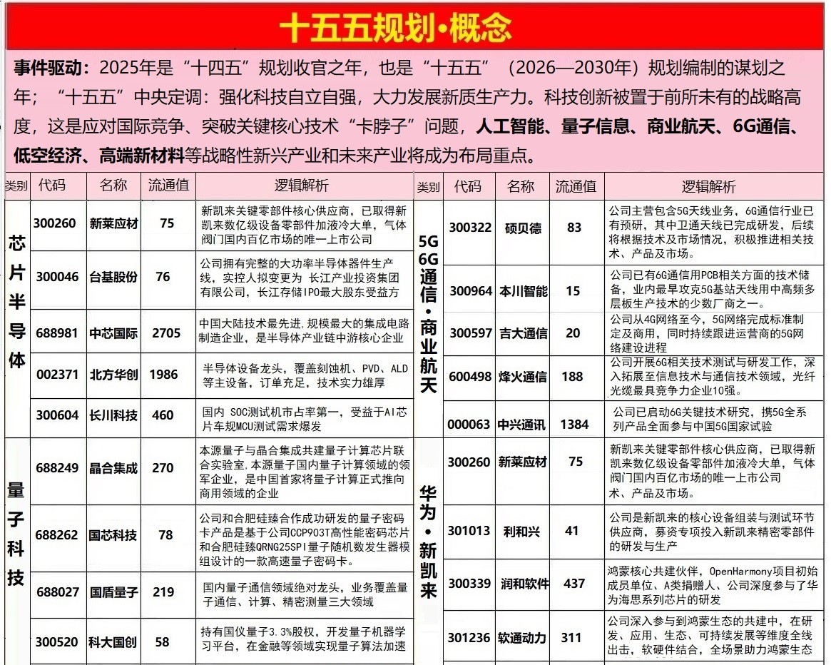 - 核心逻辑:2025年为“十五五”规划谋划关键年,相关会议将于10月20–23日召开,6G、量子信息、人工智能、集成电路等科技前沿领域受关注。