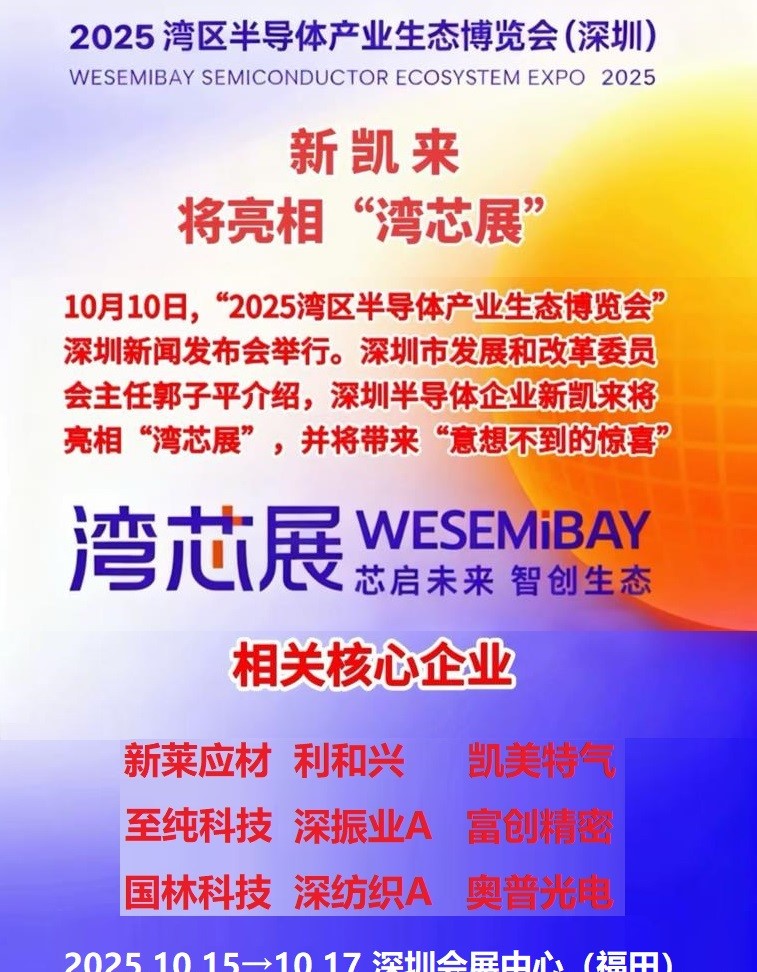- 核心逻辑:第二届湾区半导体产业生态博览会(湾芯展2025)将于10月15–17日在深圳举办,芯片设备企业新凯来确认参展并将发布重磅新品,市场关注其产品与技术突破。