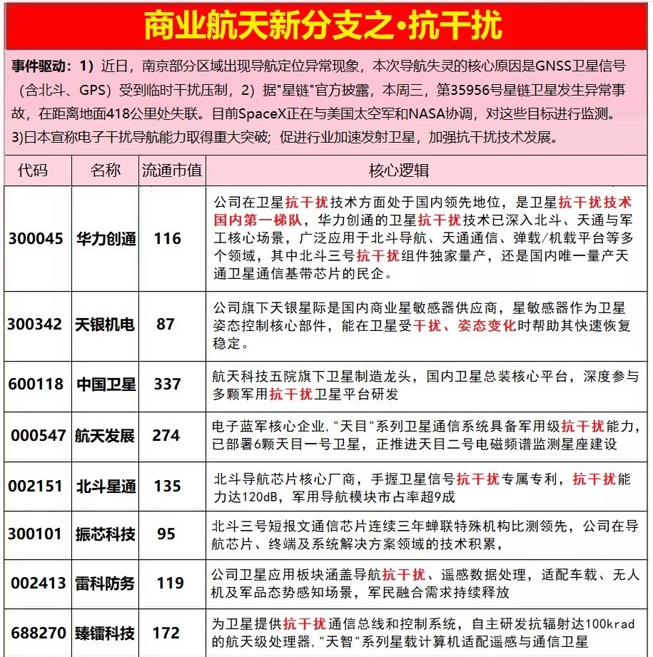 - 核心逻辑:SpaceX确认计划于2026年完成IPO,市场关注度提升;国内南京导航集体失灵事件,凸显加强卫星星座建设与抗干扰技术的紧迫性,加速行业自主发展。